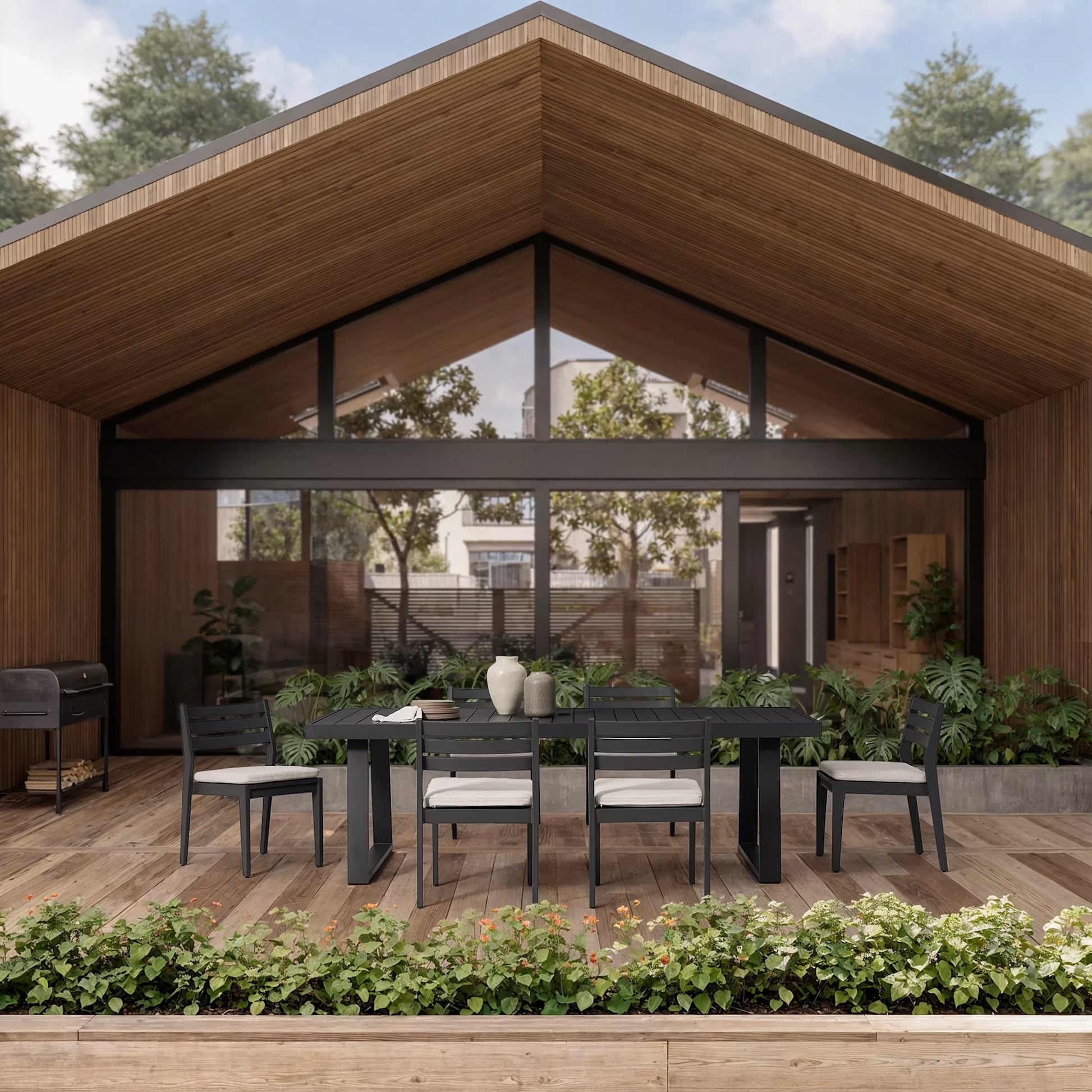 Sleek, robust, and modern. This 6-seater set (1 table, 6 chairs) is expertly crafted from high-quality iron for maximum outdoor durability and stability. Features a contemporary slatted design and a dark, weather-resistant finish. Perfect for smaller patios and decks.